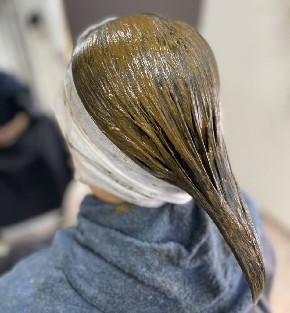 当店はヘッドオイルマッサージ後、髪と頭皮を傷つけないように穏やかにヘナを塗っていきます。