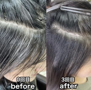 1ヵ月間で3回染める事で今まで染めていた部分とのギャップを一度に無くします。