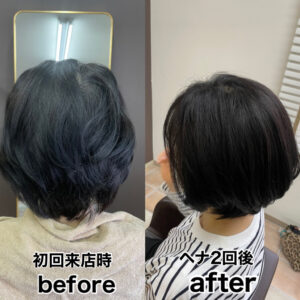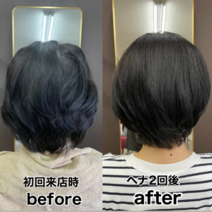 始めのうちは色落ちも早いため、2〜3週間スパンの施術をオススメしております。ヘナが定着してくると、1ヶ月〜2ヶ月スパンの施術でご来店されるお客様が多いです。ヘナやインディゴの染毛は草木染めと同じように、繰り返し色素を重ねていくことで綺麗な色味が完成し髪質も良い状態になります。