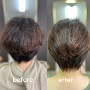 ヘナの場合、白髪をボカし活かすので染まりはグラデーションに。更に毛先にはまとまりと艶、そして髪にハリコシが生まれボリュームアップします。