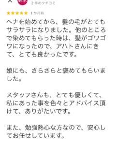 - ヘナ施術単品のメニューで2時間ほど、ヘナ施術とカットのメニューですと2時間半ほど見ていただいております。